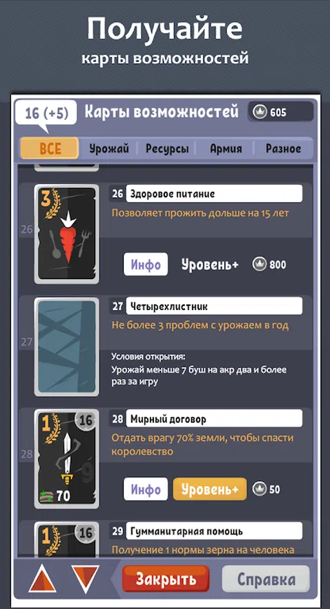 谁是国王中的最后一个?没有人。拿冠去吧!提升您的管理能力。 在游戏中,您正在等待经济决策(例如,要播种多少土地),社会决策(例如,举行丰收节或骑士锦标赛),军事决策(例如,应派多少人保卫王国)以及城市事件的决策(例如,是否允许狩猎)在海狸上)。 游戏的机制非常简单。您可以使用4种资源:人口(人),谷物(灌木丛),土地(英亩)和受欢迎程度(%)。在年初时,您需要做出一些重要的决定,在年底时,您需要研究有关沙特王国当前状况的报告。 游戏有2种类型:独立输入数值和从建议的选项中进行选择。 使用不同的管理策略:等待有利可图的讨价还价,在谷仓或突袭邻居中保存粮食。 在位期间,您将获得经验,可以在游戏结束时交换硬币,智慧或在带有机会卡的袋子中购买地方。 智慧选项使您可以对城市事件做出更有利可图的决定。提高它,没有任何事件会过去。 使用卡扩展了您的选择。您可以通过完成任务或在城市活动中做出正确的决定来获得卡片。不要忘记增加卡的级别。 “磨刀工具”卡可提高谷物种植者的生产率,而“优质萨满”卡可节省恶劣天气带来的收成。您将了解游戏中的其他卡牌。 合理分配资源并保持使用尽可能多的时间。 具有自己特征的不同王国不会让您感到无聊,某个地方会定期出现冬天,某个地方会受到龙的袭击。 长期统治会使您感到疲倦,但您可以暂停游戏并在需要时继续进行。 请记住,您的主要目标是找到邪恶的根源并消灭它!然后,繁荣与繁荣将返回大陆。最后的希望给你! 感谢您阅读到最后。 在游戏中,将消息“ 100coin”发送到服务器并收到礼物! 我们讨论诸如还原帐户或如何返回VK组或Telegram中的滑块的问题.