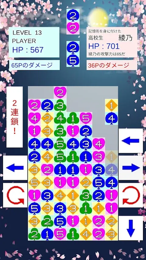 看来我们对三的倍数不太了解。 你能靠运气赢吗?你不能靠运气赢吗? 两个会消失吗?甚至没有十个消失? 当连接的相同标记的总数变为3的倍数时,您就是遮阳板! 如果您将其擦除一次,对手将发起攻击。 让我们尽可能长地联系或瞄准连锁! 将攻击力提高一倍。让我们的目标是大转变