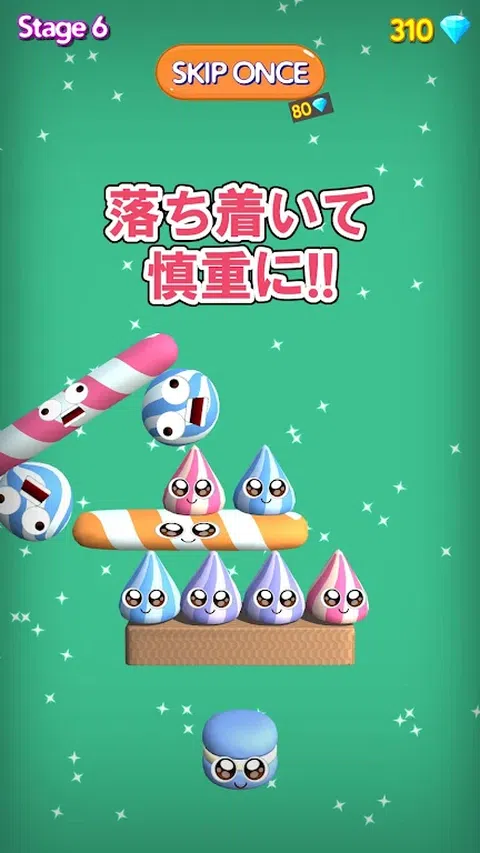 “ Poppin糖果”是一款益智游戏,您可以堆叠糖果并保持5秒钟的平衡。 共有8种和18种五颜六色的糖果。 难度分为3种类型:50个正常阶段和50个困难阶段 它由10个不同的动物阶段组成〜 《怎么玩》 首先,选择您喜欢的难度级别并开始第一阶段。 基本操作是拖放。 点击并移动糖果以在您喜欢的地方跳跃并释放它,以完成放置。 剩下的就是加曼的5秒。如果您拥有一个完美的平衡,请转到下一个阶段! 随着阶段的进行,基础块和啤酒花糖果的数量将增加。 让我们用灵活的想法克服困难的阶段。 即使您输入有误,也可以立即重试,因此,请尝试一下并将其放入。 一旦您清除了任意多的次数,就可以播放该舞台。 当您清理舞台时,将收集钻石。 通过使用累积的钻石,您可以跳过下一跳糖果。 动物阶段比较困难。您也可以在清除正常后再尝试尝试。 您可以从头开始尝试。让我们在享受甜美动物外观的同时堆放糖果