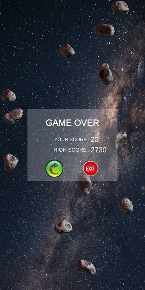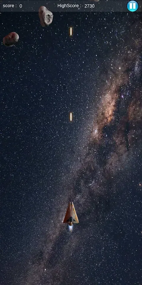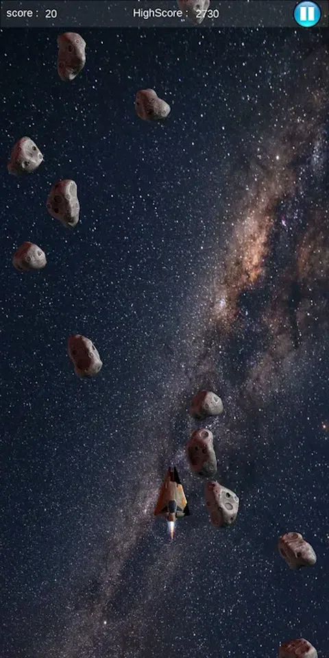 这是一款太空战斗游戏,用太空飞船的子弹摧毁小行星,每次摧毁小行星可获得10分