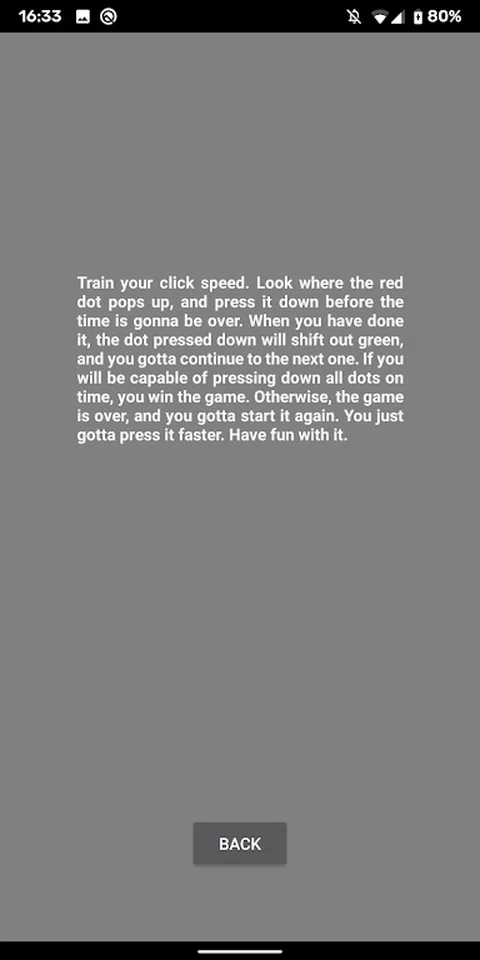 训练您的点击速度。看看红点弹出的位置,在时间结束之前按下它。完成后,按下的点将变为绿色,您必须继续下一个。如果您能够按时按下所有点,您就赢得了比赛。否则,游戏结束,您必须重新开始。你只需要更快地按下它。玩得开心