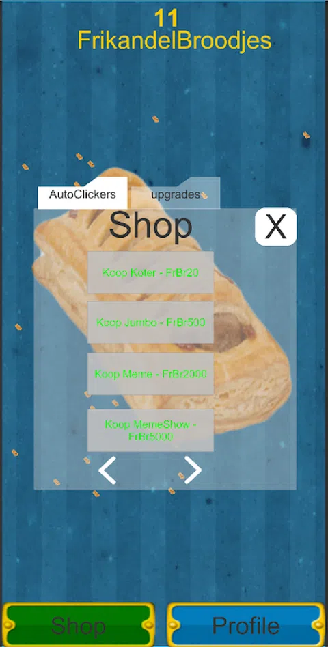 我们当中最适合真正的Koters的荷兰Clicker游戏! 单击大Frikandel面包卷即可赚取Frikandel面包卷! 购买那些Frikandel面包卷来升级! 游戏非常简单: -单击中间的大frikandel面包卷以获取积分。 -通过这些积分,您可以再次购买升级版,以便您可以更快,更高效地单击大型frikandel面包卷。 如果发现错误,可以将其发送到此gmail地址: 注意