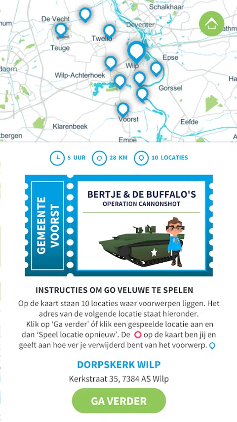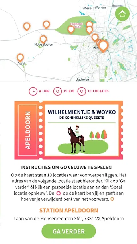 发现Veluwe的小秘密 Veluwe充满了令人兴奋的秘密和历史宝藏。你还想发现它吗?如果你要玩Go Veluwe户外冒险游戏,这是可能的!使用Go Veluwe,您可以在每个路线游戏中循环到不同的游戏位置。在每个路线游戏中,主要角色是在Go Veluwe的时间机器中从过去传送到现在的孩子。第一条路线已经在阿珀尔多伦(Apeldoorn)发起,其中威廉敏娜女王(Queen Wilhelmina)作为十年前的Wilhelmientje,是故事中的主角。与Wilhelmientje一起,你会去'Royal Queeste'。在这次搜索中,您将发现阿尔格多伦的不同地方,Wilhelmientje留下了它的标记。 一个自由和运动的一天 免费下载应用程序并在Go Veluwe选择路线游戏。然后骑上自行车,体验Veluwe的精彩故事和主角。在应用程序的帮助下,您将搜索过去10个秘密游戏场所的许多物品。那些对象并不存在,但出现在增强现实中。所以你只能通过Go Veluwe应用程序看到它们。之后,您将听到一个简短的音频导览,其中包含有关该地区历史的令人兴奋的秘密。如果您已经注意,您可以回答一个可以获得优惠券的问题。然后你踏上自行车继续前往下一个位置,寻找更多令人兴奋的故事。 为什么去Veluwe? Go Veluwe由Mathanje Huisman构思和开发。这个户外冒险游戏是2017年12月由海尔德兰省颁发的Veluwe比赛的获奖计划之一.Mathanje在Veluwe与家人一起骑车时受到启发。她意识到,许多历史故事都在等待再次被告知和体验。通过将增强现实游戏和音频游览作为环境的补充,讲述令人兴奋的教育故事。这使历史保持活力,变得有趣和有教育意义。快来玩Go Veluwe,带上全家
