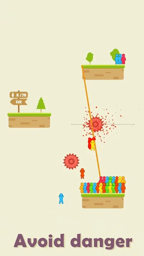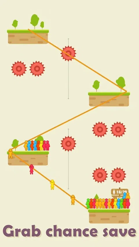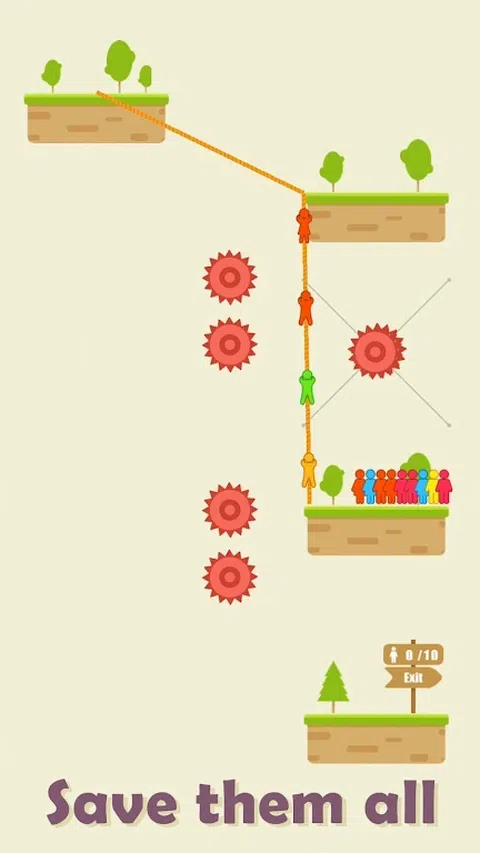 找到正确的方向并点击射击绳索。 如果绳子能连接两块石头,再敲一下,解救被困游客! 但是,要小心齿轮,如果游客在移动时碰到齿轮,他们会死的! 你能拯救他们所有人吗?让我们来看看