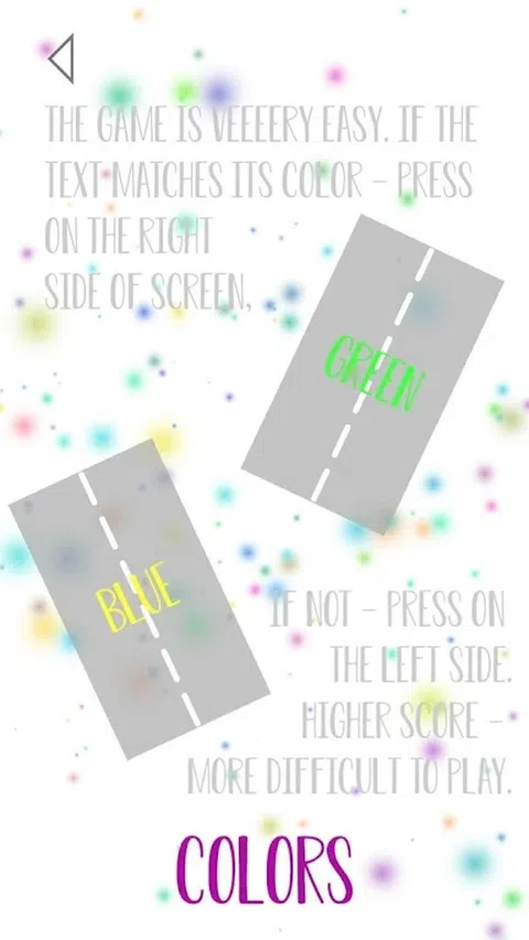 简单的游戏,愉快的设计。 不需要玩,你可以在主菜单中放松音乐和降雪的平静效果。 在游戏中,您将通过选择文本是否与颜色匹配来测试您的视觉反应和注意力。 立即尝试并与您的朋友分享您的高分,让他们知道谁才是真正的色彩大师! 让我们看看你能坚持多久。