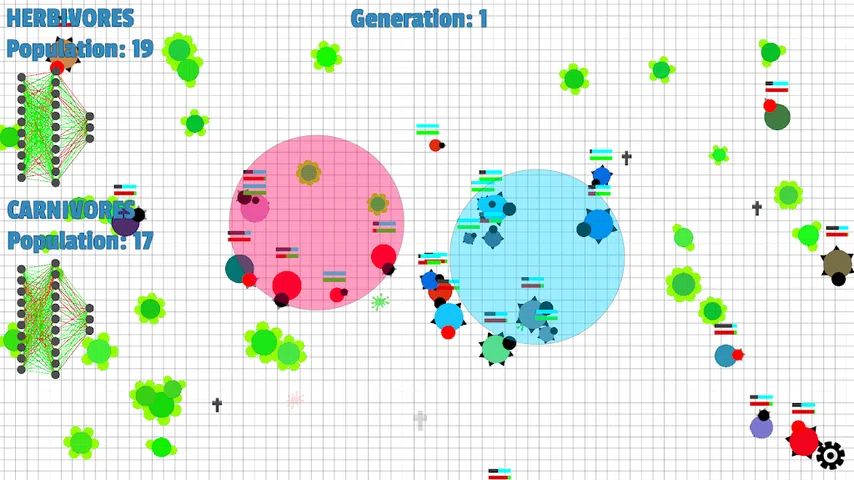 这个应用程序的目的是模拟进化生物的自然选择。有两种生物:食肉动物和食草动物。每个生物都必须将猎物带入家庭圈内。如果它们成功,它们将通过有丝分裂繁殖。如果生命值耗尽或年龄等于寿命值,生物将死亡。生物可能会受到其他生物或饥饿的伤害。 每个生物都有一个大脑(神经网络),它在三个选项中做出决定:前进、右转、左转。该网络是使用遗传算法进化而来的。 关于神经网络: 神经网络是一组算法,松散地模仿人脑,旨在识别模式。在这个应用程序中,生物将学习识别它们与环境物体的位置和距离之间的模式。 关于遗传算法: 遗传算法反复修改生物种群。在每一步,遗传算法从当前种群中选择表现最佳的生物作为父母,并使用它们为下一代生产孩子