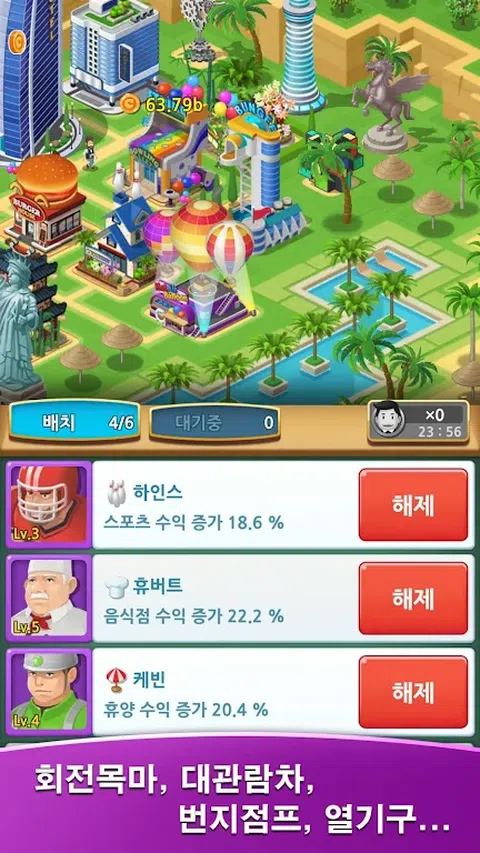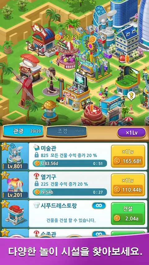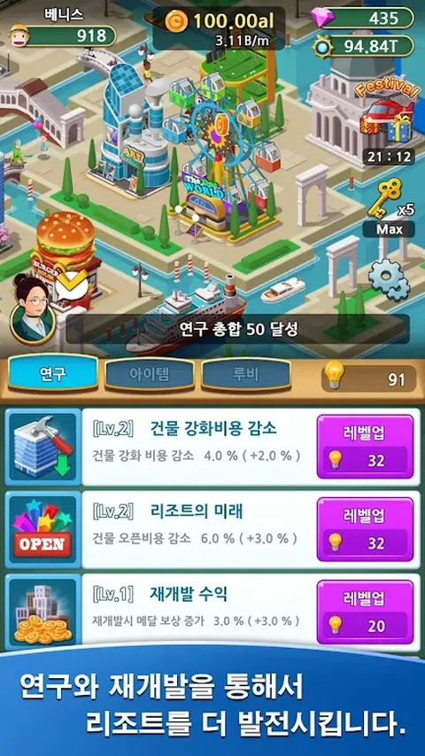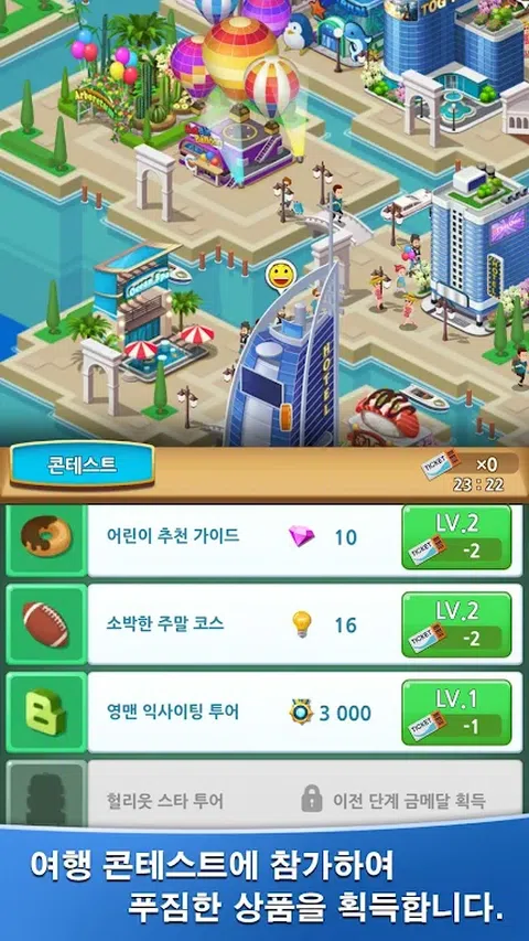 [ VIP 福利 ] 每8小时可获得100红宝石。(最多1,000) 无需任何广告曝光,您将获得各种奖励。 [ 故事 ] 主角是一位生意兴隆的商人。 [ 游戏特色 ] 济州岛、大坂、迪拜、夏威夷。 建造从汉堡店到歌剧院的不同建筑物。 通过建筑装饰进一步发展成炫酷的建筑。 雇用不同的员工以提高度假村的生产力。 通过研究降低成本,提高利润。 您可以通过小游戏快速赚取利润。 参加比赛并获得不同的奖品。 注意游客的说法,会有意外的运气。 只需按照任务即可轻松推进故事。 即使比赛结束后,您的度假村仍在积极运营
