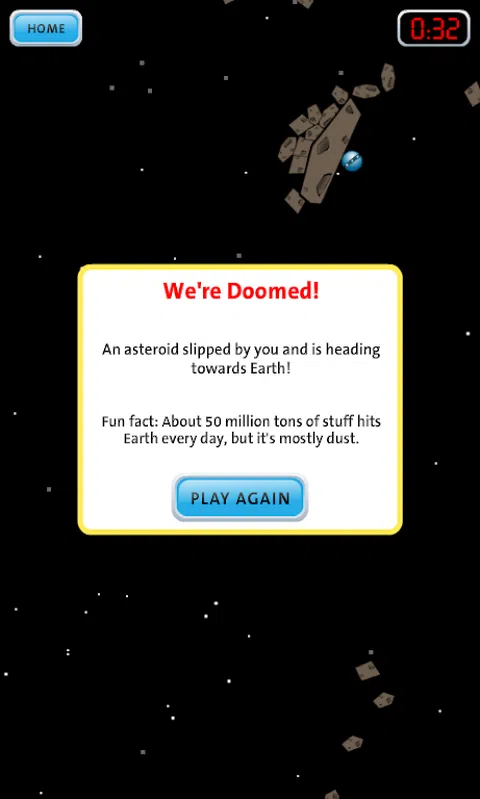 小行星可以是单块岩石,也可以是由相互重力结合在一起的较小岩石团块。他们中的一群人正朝着地球进发!你的工作:在时间用完之前使用炸弹和撞击器将它们偏转远离地球。人类取决于你!请记住:那些只是炸毁小行星而碎片无关紧要的电影?这实际上行不通。 这是一款基于Box2D物理引擎的简单单级游戏。单个小行星以物理上一致的方式通过相互的重力相互吸引。致教师:瓦砾