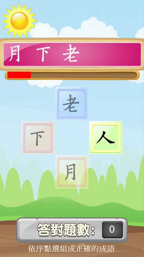 汉语成语估计至少有两万多则以上,这些成语是历史的遗迹,社会的浓缩精华,也是文化的极致表现。 成语结合了思想、语言、文学与艺术而成为综合的载体,言简意赅、尺幅千里是古代文化的智慧结晶。 在时间内依序挑选排列出正确的成语来获得高分, 挑战世界上其他玩家成为排行榜的状元探花吧