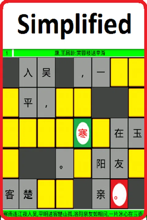 我们收集了130首流行唐诗,数百种变化。每首诗都有一个音频(声音)可以朗读给您听。简体字,唐诗。 要播放一首诗,只需单击一个按钮和一个网格(或一个网格和一个按钮)即可将水平、垂直或对角连接的连续汉字按诗序填充到网格中,以填充空网格。 它适用于 Android 手机和平板电脑
