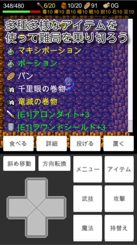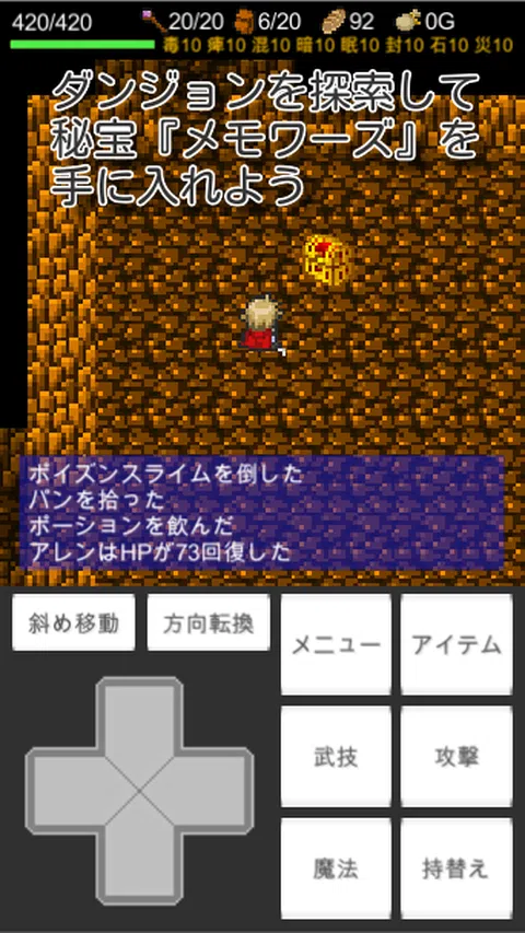 Rogue Memowords是一款以回合为基础的地下城搜索roguelike游戏,以其神秘的地下城系列而闻名。 【游戏特色】 ·每次进入时都会改变形状的地牢 ·如果玩家行动一次,敌人也行动一次(转身系统) ·120个独特的怪物 ·超过150项,超过50项技术和魔力 ·黑客和类似斜线的增长系统 ·收集和加强特殊项目“Memowards” ·超过500个收藏元素,如插图书籍和标题 【游戏基础】 游戏的基础遵循一般回合制的地下城搜索roguelike游戏。 因此,如果您玩过其他roguelike游戏,只需查看操作方法就可以在某种程度上发挥作用。 [与常见的roguelike游戏的主要区别] ·所有地牢中都会出现称为地板效果的地下城特效 - 地下楼梯不能在开始捕捉地板的阶段使用,但可以使用黄色魔法圈首先打开封印 ·可以通过获取名为Memowords的特殊项目来选择初始能力 ·玩家角色通过吃掉在没有经验点和升级概念的情况下击败怪物时可以获得的肉来增长 ·能装备多个武器和装甲,装备的东西可以在不转弯的情况下改变 ·有一种叫做武术的技术系统,通过记忆可以在房间内无限制地使用它 ·魔术采用普通MP系统,但MP不会自动恢复,但只能在你打开楼梯或使用物品的时间恢复 [游戏目的] 第一个目标是征服五个地下城(以获得远端的备忘录)。 由于Memords不仅在最深处,而且每5级都在下降,所以首先尝试在任何地牢中获得第一个Memords。 【游戏流程】 基本流程如下。 1。挑战地牢并获得备忘录 2。 (如果有多个记忆)结合并加强获得的记忆 3。通过使用获取/增强备忘录深入了解图层,获得更深入的备忘录 重复步骤4