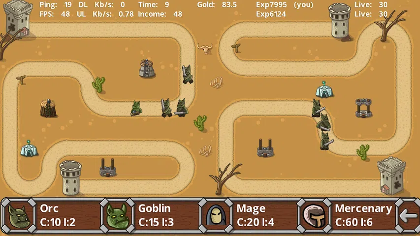 在一款多人游戏中,你必须保卫你的据点免受敌方怪物的攻击,并向敌人的据点派遣部队。胜利的关键是在防御武器建筑和部队创建之间合理分配资源,因为你向敌人派遣的部队越多,你未来拥有的资源就越多