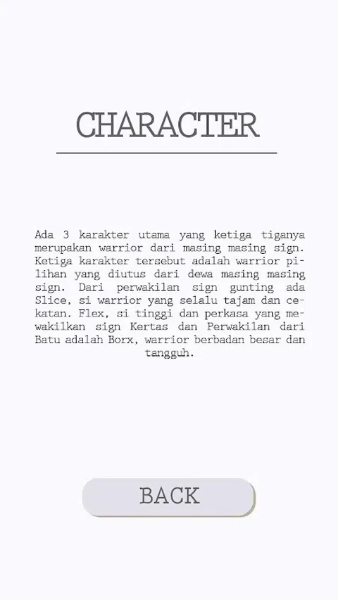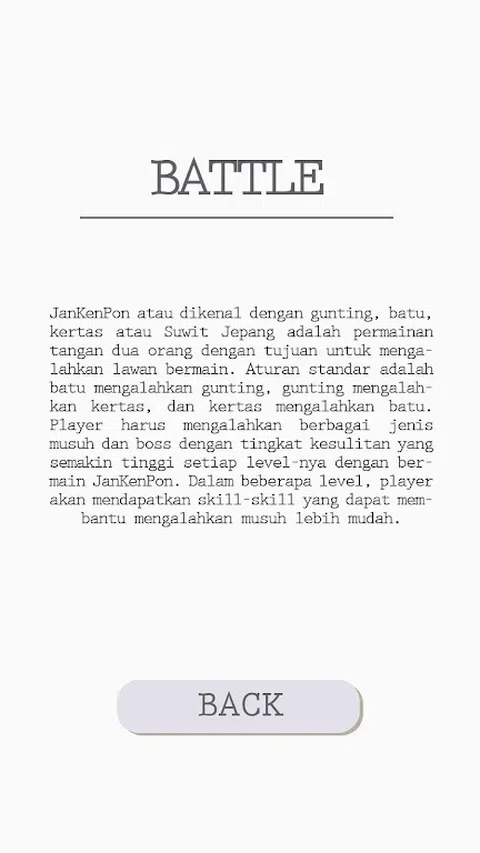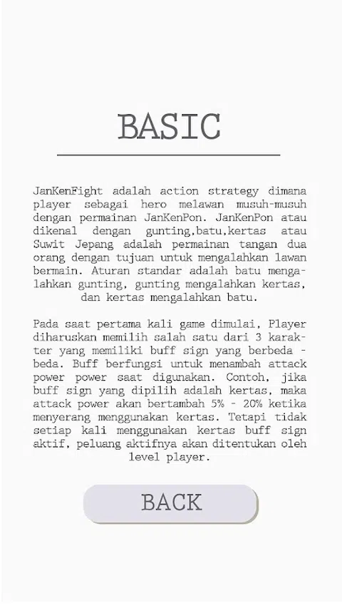 JanKenFight 是一种行动策略,玩家作为英雄通过游戏 JanKenPon 与敌人战斗。JanKenPon 也被称为剪刀、石头、布或日本 Suwit 是一种两人手牌游戏,目的是打败对手。标准的规则是摇滚节拍喷枪,喷枪打纸,纸打石头。玩家必须通过玩JanKenPon打败每一关难度更高的各种类型的敌人和boss。在几个等级中,玩家将获得技能-技能可以帮助更轻松地击败敌人。 这款游戏采用了独特的游戏理念和可视化游戏有趣的设计,而且这款游戏配备了一个功能,每个玩家可以选择他们想要使用的玩家。艾达3个主要角色,其中三个是每个标记的战士。三个角色分别是神仙派来的战士标志。签署的代表是Slice,一向敏锐敏捷的si战士