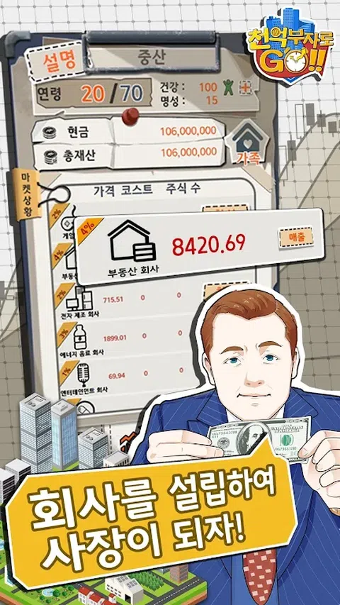 超现实的企业和生活体验!人生是选择的延续! 在这个游戏中学习生活哲学,这是一个由成千上万的银行家和投资者推荐的游戏。 只有智商大于180的人才能实现1000亿资本的目标。你想挑战自己吗? - 未来版本更新功能通知:添加了Facebook互通,代码交换,咖啡馆活动等 ◆游戏目标 在70轮内收集惊人的资产,享受1000亿人的生活。 ◆市场 以低价购买产品并以高价出售以创造利润以扩展您的仓库并收集业务资金。 ◆公司 你可以建立一个公司并赚钱。但是,公司有可能破产,所以要小心
