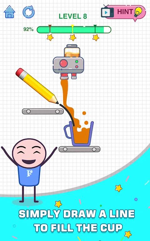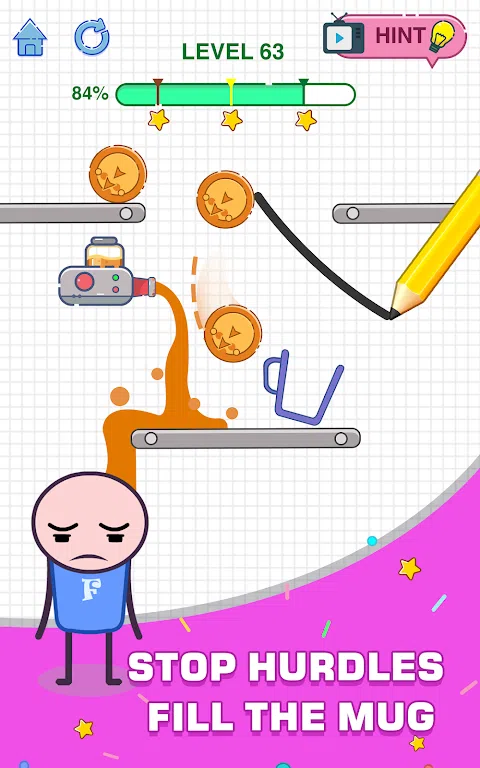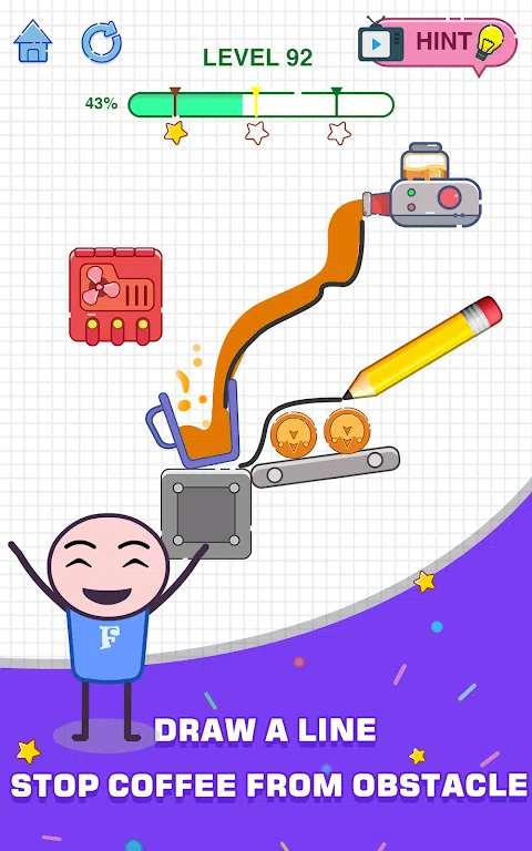 迈克和快乐杯 - 你的工作就是让这个悲伤的迈克高兴起来,因为杯子是空的。只有在杯子里装满咖啡才能让他高兴起来,所以只需画一条线,让杯子里装满咖啡,就能让他再次开心起来! 让你的想法自由发挥,以你自己的创意方式解决所有谜题,并获得 3 颗星和最高分,让迈克再次感到自豪和微笑! 游戏特色: * 适合所有人的简单、直观的游戏玩法。现在就试试! * 玩起来很简单,即使没有网络,也可以在任何地方玩! 如果您在玩游戏时需要任何帮助,请随时点击游戏内设置屏幕中的联系按钮来联系支持团队。 我希望你喜欢迈克和快乐格拉斯