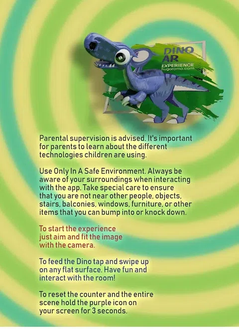 借助增强现实技术,您可以让您的恐龙 T 恤栩栩如生!只需扫描衬衫的正面,尝试将整个 Dino 放入框架中。留出几秒钟让您的手机检测环境(为了获得更好的跟踪结果和更好的体验,在动画开始播放后将手机多拿一秒,让相机不仅可以完成对图像的跟踪,还可以完成对周围环境的跟踪)。 然后该应用程序将寻找平面并绘制虚拟平面。点击这些飞机中的任何一个,为您的恐龙制造美味佳肴。用手指轻弹零食,对准恐龙的嘴巴。纵然他是捕食高手。你仍然需要给他一个很好的机会。虽然它变得棘手!您可以在房间内弹跳零食并测试您的投掷弹跳能力 :) *建议家长监督。这一点很重要 让家长了解不同的 孩子们正在使用的技术。 *仅在安全的环境中使用。一直是 互动时注意周围环境 与应用程序。特别注意确保 您不靠近其他人、物体、 楼梯、阳台、窗户、家具或其他 您可能会撞到或撞倒的物品