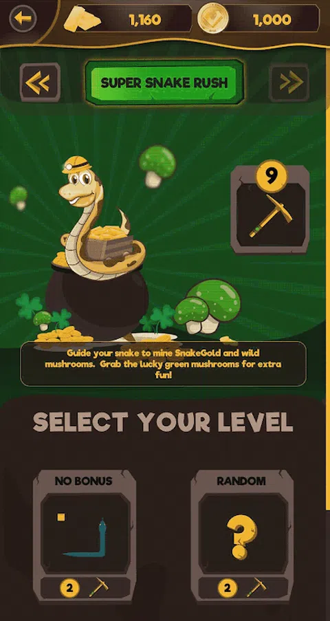 Snake Rush: The Snake Game是一款经典手机游戏的有趣玩法。简单而有趣的游戏,进入蛇世界,蛇从蛇山开采黄金,并在蛇银行铸造矿石。 蛇会遇到野生蘑菇,解锁隐藏的世界、设备和奖励。但是要小心,因为并非所有的蘑菇都适合食用. 加入Miner Snake,踏上通往彩虹尽头的冒险之旅,以节省他父亲的退休金! 矿工蛇和他的朋友们在穿越蛇世界,从暴虐的蛇公司和蛇银行中寻求宁静和自由时,遇到了许多考验和磨难。 像您记得的那样玩Snake,但通过简单易用的游戏进行了改进: 游戏模式: - 复古蛇 - Snake Rush经典 - 超级蛇冲刺 - 战蛇模式 特色: - > 80小时的独特游戏玩法 - 可收藏的蛇皮 - 蛇金 - 蛇银行硬币 - 黄金门票 - 蘑菇增强道具 - 野生蘑菇 - 幸运蘑菇 - 黄金镐 . 更多 拥有超过 80 小时的独特游戏玩法,以及十几种并且还在不断增长的蛇皮,这是消磨时间和享受无意识活动的完美方式