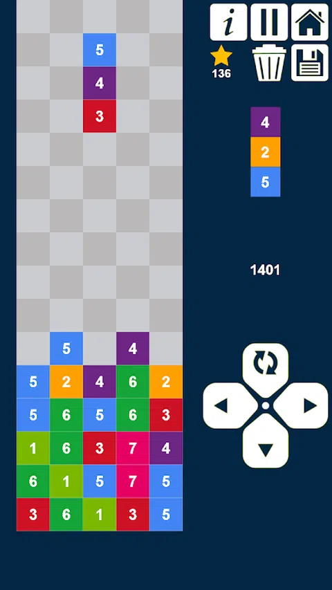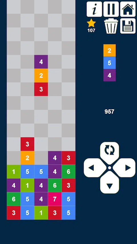 引导并放下下降列以在水平和垂直方向上匹配3个或更多相同的相邻数字,然后将它们合并为下一个较高的数字。相同数字的计数越大,得分就越高。 这是一个令人上瘾的大脑训练数字游戏。 简单规则: -每场比赛都会获得1星。 -使用删除按钮从网格中删除数字需要100颗星。 -当您用尽尝试(没有足够的空间让下降的列着陆)和星星时,游戏结束。 -您有责任保存进度,然后点击保存按钮以恢复进度。 每一个新级别:最小和最大生成数字增加1。因此,请尝试在下一级别之前匹配所有最小数字,因为它们将不会再次生成。 屏幕右下方有4个按钮。右按钮是将列向右移。左键是将列向左移。底部按钮用于将列指向底部。最上方的按钮是重新排列下降栏中数字的位置。 玩和享受