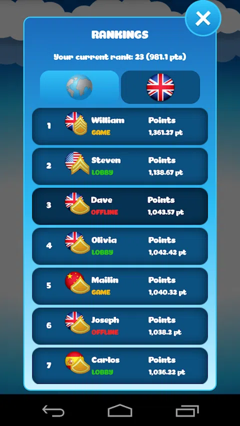 〜 最重要的特点: 〜 - 与来自世界各地的用户对战 - 与你的朋友进行本地游戏 - 全球排行榜 - 好友列表 - 聊天功能 〜 更多细节 〜 - 如果你在在线多人游戏模式中击败了在线对手,你每次获胜都会获得相应的积分 - 如果您在在线多人游戏模式中连续击败一位非常优秀的在线对手,您将获得更多获胜积分 - 连续进行 4 场比赛时获得的积分越多,您在排名中的排名就越高 - 一面旗帜显示对手的原籍国 - 获得不同的徽章 - 通过集成的聊天功能与来自世界各地的对手交谈 - 史上经典的四连胜游戏以免费应用程序的形式在全球范围内提供。因此,您可以与国际对手在线比赛。你的战术有多好,你的逻辑思维比你的国际对手更好吗?你会成为第一个将你的圆盘排成一排的人吗?战术、策略和逻辑思维才是决定性的! 我们希望您喜欢我们的免费 4 in a Row 应用程序!我们感谢您对我们的免费国际在线策略游戏的反馈(即使它很重要)。向我们发送邮件至指定的支持地址。玩得开心并永远记住:连续 4 个