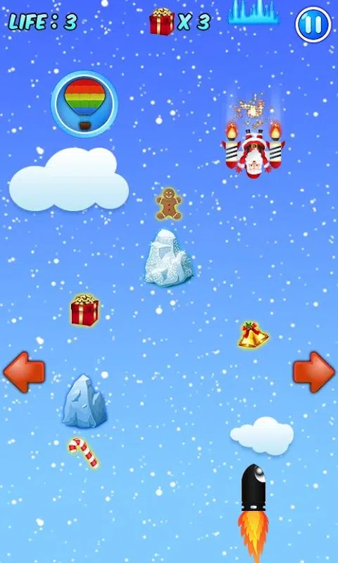 准备好迎接最棒的魔法冒险和娱乐性圣诞游戏圣诞老人天降吧。圣诞老人从一个城市飞到另一个城市,传播上帝的祝福,让孩子们开心。飞行途中,礼物从飞机上掉了下来,圣诞老人没有浪费任何一秒钟的时间跳起来收集它们,幸好他有降落伞,但这还不足以收集所有礼物。导弹、怪物岩石、雪岩和雪火等障碍太多了,圣诞老人需要你的帮助来躲避它们。在这个迷人的飞行旅程中,确保他乘坐热气球、降落伞和喷气背包顺利飞行,并在途中收集尽可能多的礼物