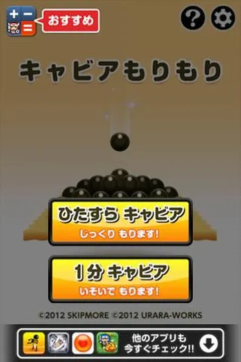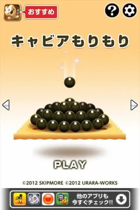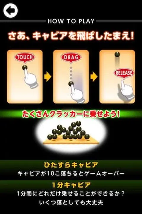 弹动鱼子酱并将其装在饼干上! 前所未见的鱼子酱动作游戏! 两种模式让您尽情享用鱼子酱! = 怎么玩= (一)规则 ★ 用手指拖动鱼子酱并将其松开。 ★ 鱼子酱会向前飞。 ★ 尽最大努力在饼干上装载尽可能多的鱼子酱。 (2) 游戏模式 ★ 稳定鱼子酱:继续堆放鱼子酱 - 但如果你掉落 10 个鱼子酱,游戏就结束了。 ★ 1 分钟鱼子酱:这是一种计时攻击模式,但掉落的鱼子酱不会受到惩罚。 艺术、声音和游戏设计:SKIPMORE 编程:URARA-WORKS Co., Ltd