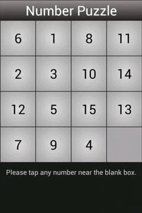 数字拼图是一个简单的游戏来测试你的大脑。在这个游戏中,您会发现出现15个数字的洗牌,您必须按顺序排列。任何数字都可以通过触摸数字来移动到空白框。你只能移动直接靠近空白盒的数字,而不是对角线,享受