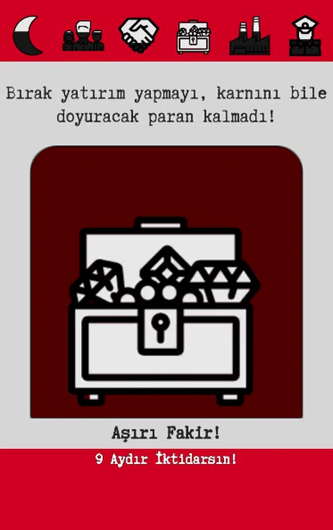 现在,国家的命运就在您的指尖! 总统府打来电话!您能应对国家问题并保持执政多年吗?还是将您留在历史的尘土飞扬的角落?做出决定,决定国家的未来! +通过向左和向右扔牌来做出决定! 应付命运给您带来的好处,并平衡每个环节! +抵御威胁您的国家并为您的人民服务! +像真正的总统一样管理! 怎么玩? 在屏幕上选择您的总裁后,每个月都会出现一个字符,告诉您情况或提出问题。作为该国家/地区的管理者,您可以向左或向右拉这些卡片,并查看卡片下方写的答案选项。当您将卡留在右边时,右边的答案就是答案。当您将其留在左侧时,将接受左侧的答案。左右拉动卡片时,您需要注意的是答案出现时顶部图标上出现的点。这些要点显示了哪些变量将影响您将要做出的决定(宗教,人,盟国,国库,工业,民权),但没有显示这些变量将改变多少。您在回答并仔细做出决定时应考虑这一点。目的是保持最长的权力。完成后,如果您已登录(主菜单中的黑色图标),则您的得分和成就将保留。这样,您可以与排名中的人打架。快过来