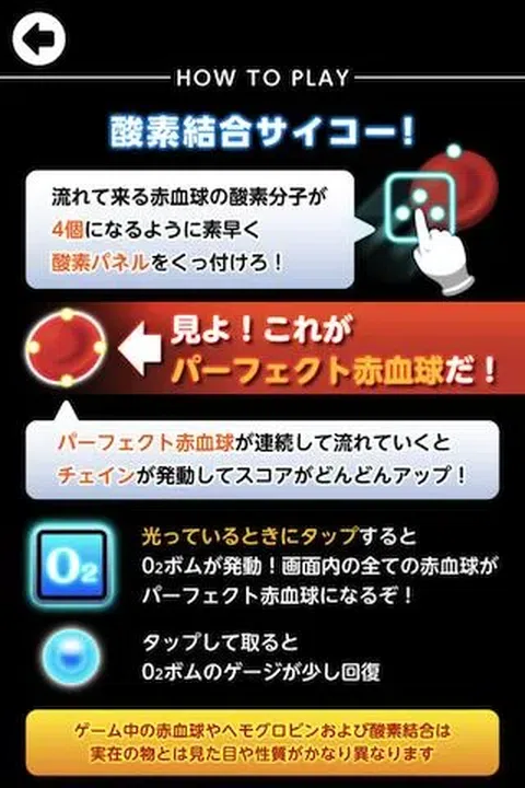 引入全新的基于血液的动作解谜体验! 当红细胞流经血液时,您的工作就是将氧分子与它们结合! *注:实际的红细胞和血红蛋白在外观和形态上与游戏中看到的有很大不同。 = 怎么玩= (一)规则 ★一旦一个细胞附着了4个氧分子,它就是一个“完美的红细胞” ★当你创造出更完美的红细胞时,一条链就会形成,从而提高你的分数。 (2)氧气弹 ★当屏幕右上角的O2按钮开始闪烁时,您可以点击它来发射氧气弹。这颗炸弹会补充屏幕上的所有红细胞并使它们变得完美。 ★偶尔,您会看到氧气瓶漂浮在其中。点击它可以部分补充您的 O2 炸弹量表。收集更多这些来填充它。 艺术、声音和游戏设计:SKIPMORE 编程:URARA-WORKS Co., Ltd
