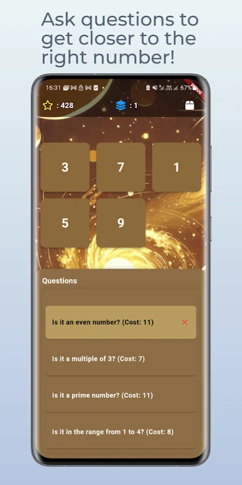 Number Quest - 益智游戏 通过 Number Quest 潜入令人兴奋的数字世界!通过引人入胜的谜题挑战您的思维,测试您的数字技能和逻辑能力。无论您是休闲游戏玩家还是益智爱好者,这款游戏都提供无尽的乐趣和精神刺激。 主要特点: 引人入胜的关卡:从简单的谜题开始,逐步进入更具挑战性的关卡。 道具:收集并使用各种道具,帮助您更快更有效地解决难题。 提示和帮助:当您遇到困难时使用提示或观看广告以获得提升。 保存并继续:保存游戏进度并从上次中断的地方继续。 多语言支持:支持多种语言,包括英语、德语、法语、西班牙语和匈牙利语。 广告集成:观看奖励广告以赚取额外的生命和其他好处。 怎么玩: 寻找目标数字:使用逻辑和给定的线索,从一组数字中找出目标数字。 回答问题:使用诸如“它是质数吗?”之类的问题或“它是否大于 X?”缩小您的选择范围。 收集道具:利用道具,例如删除不正确的数字或揭示数字来帮助解决难题。 进步和赚取积分:您解决谜题的速度越快、效率越高,您的分数就越高。 立即下载并开始您的数字探索! 挑战您的大脑,享受数字探索的乐趣。立即下载,看看您能在这个令人上瘾的数字益智游戏中走多远