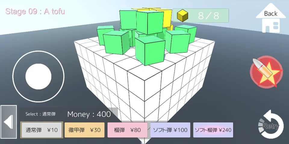 用炮弹粉碎堆积的建筑物, 将目标方块扔到地上。 有各种各样的贝壳, 昂贵的子弹可以更令人振奋地破坏方块