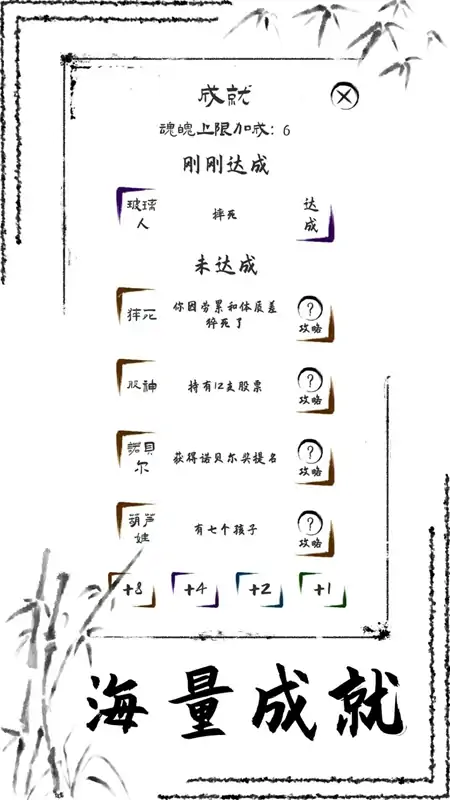 投胎转世轮回,重启逆袭人生 俗话说的好,投胎是个技术活儿。通过转世轮回,在每一年的人生事件中做出自己的选择,不断积攒功德,可以获得更多的投胎点数,增加自己出生时的智力、体质、艺术、幸运、悟性或家境。所以,第一次投胎时由于缺少功德,肯定有诸多困难。但当你轮回次数够多后,人生就会如开挂一般。智力高可以走上科研路线;体质高可以当运动员并获得更长的寿命;艺术高可以当网红、演员、艺术家;幸运高可以遇到各种奇遇或者走上创业道路;悟性高可以体悟人生,锻炼魂魄;家境好可以搞投资或者花钱换其他属性。每条路线都有独特的获取功德的方式,需要根据自己投胎后的初始属性分配情况选择合适的路线,争取在每一世获得尽可能多的功德,为下一世铺平道路。最终,在魂魄耗尽前,积攒足够的功德,冲上功德榜。 为了让每个属性都有专常,游戏内包含多条道路,分别通向诺贝尔、雨果奖、百万粉丝、奥运冠军、股神、悟道等多个人生终点,与之相伴的有超过一百个不同的成就,指引你走向人生巅峰。 玩家还可以:1、通过共创界面参与到游戏的制作和更新过程之中,说不定就能在游戏中看到自己创造的独特事件;2、通过全家福记录每一年的家族变化;3、通过结算界面的折线图查看人生的起起落落。