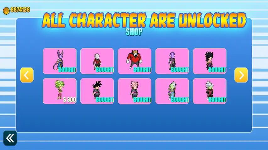 勇士锦标赛是db Ultra格斗游戏,在这里您可以选择勇士,赛亚人,霜冻,Namekians,天使或毁灭之神在这里选择勇士,赛亚人,霜降,天使或毁灭之神...并在您喜欢的模式下战斗:1vs1模式,锦标赛..到超级赛亚人1 -4,超级形式,例如ssj ssgod / blue / ultra,blackgoku ssj,金色形式等等。享受z冠军战士的赛亚人之战。所有来自db Z / KAI / GT的英雄和恶棍都在这里,选择一个并以1对1或以生存模式与其他人战斗,ssj,ssj2 / 3和4都在这里,还有着名的ultra inst。和go,蔬菜,布罗伊。那里有战斗机z的超超变,例如saiyangod,ssjblue,frieza的金色形式以及cell和forst。每个超级变身都有自己的特殊能力,例如:吹龙拳,ki blasts,能量球,死球,精神攻击炸弹,红色kameha,大爆炸攻击...并感受到所有技能和连击-您刚刚读过漫画作为ki,kamehameha,加入比赛,成为赛亚人的冠军和神。成为z族的勇士并赢得超级联赛的战斗……成为宇宙的最佳冠军