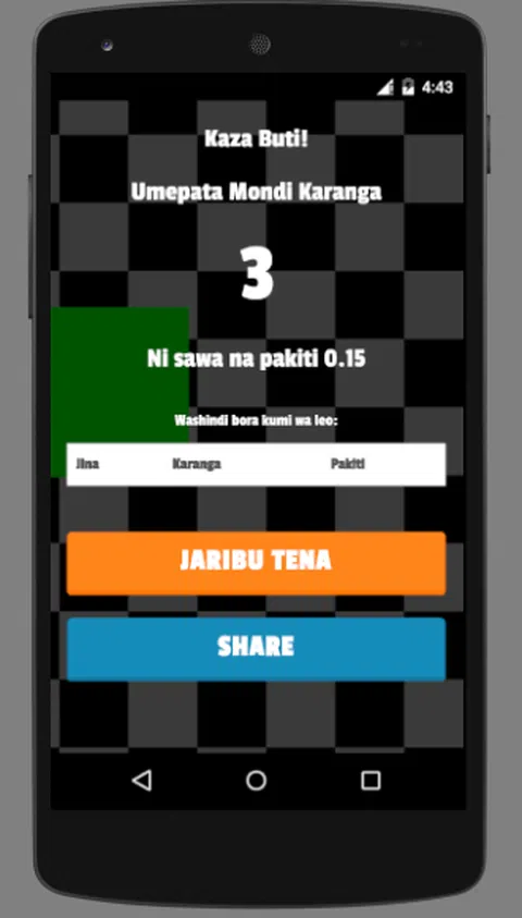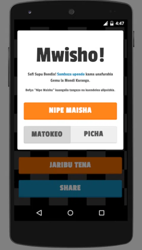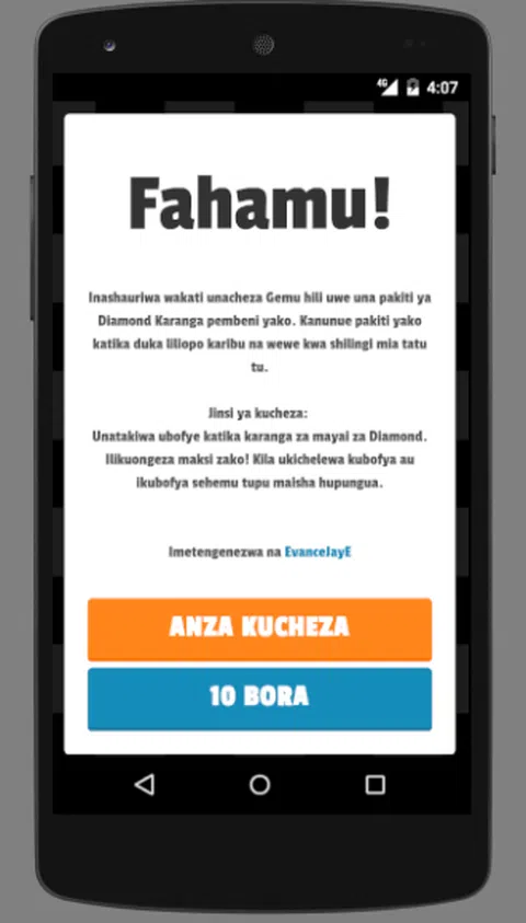 Mondi Karanga 是同类中的一颗宝石。您有机会与朋友一起玩,并争夺排名前十的 Mondi Karanga 玩家。 它被设计成一个摄像头,即使你走在路上也不会绊倒你,玩家也可以玩这个游戏。 它适合在任何时候播放,无论您是在 dala dala 队列中、在您的房间里,还是在有吵闹的酒吧里。 享受这个游戏。 传播爱心