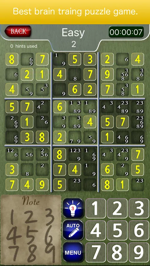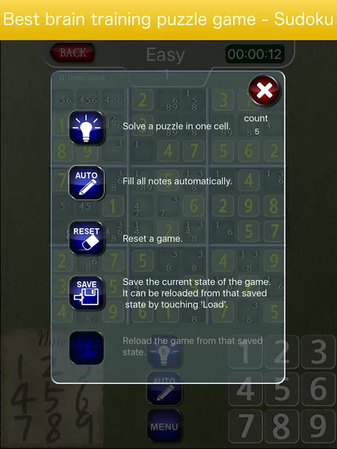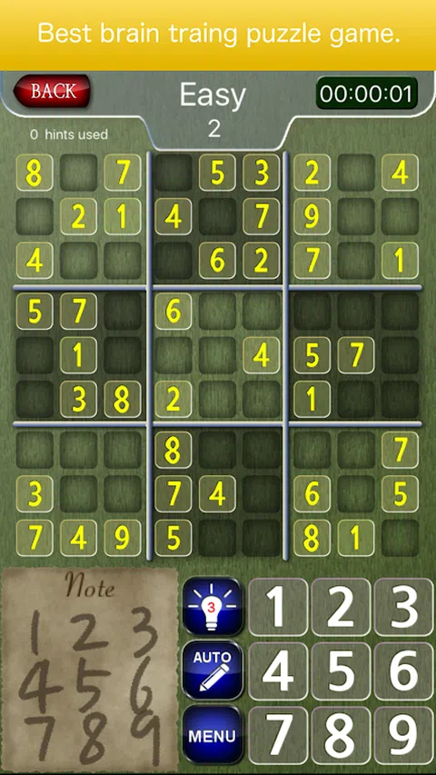 附加的功能: - 轻松保存和恢复游戏进度。 - 提供提示。 - 选定的数字突出显示。 - 警告错误输入。 - 4级:Easy Sudoku,Media Sudoku,Hard Sudoku,Expert Sudoku
