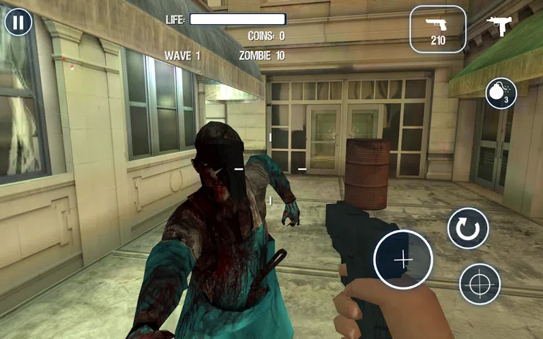 -FPS僵尸射击游戏 -3阶段 -2种武器(手枪、冲锋枪) -20级升级枪。 - 基本操作 移动。滑动屏幕的左半部分。 观点。滑动屏幕的右半部分。 火。点击屏幕右侧的大圆圈。这是触发器。 瞄准。你可以进行准确的射击。 熊炸弹。当你点击炸弹图标时,熊就会爆炸。 选择武器。点击屏幕右上角的枪 - 枪的升级 您可以在游戏开始时增强枪支。 DAMAGE.增强威力子弹 容量。增加子弹。 重新加载。减少重新加载时间。 享受!。