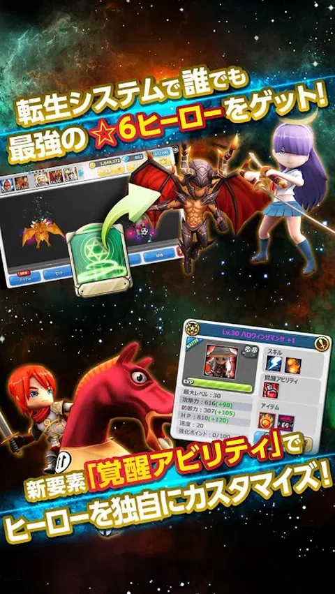 一个神秘的入侵者突然袭击了阿尔法星系边界上闪亮的行星碎片。你将成为保护银河系、恢复和平的防卫长! 300多位独特可爱的英雄活跃在全3D光动战斗模式和爽快的技能动作中。 为拯救地球和平而来的银河系各地的英雄们结为好友(战队),通过战斗、强化、转生等方式进行训练。 创建您自己的原创派对(战队)!一款流行的科幻冒险游戏! [正宗RPG] 基本免费! 以英雄为目标!可爱但真实的角色扮演游戏! ◆ 正义盟友!你好英雄 (Hello Hiro) - ■玩你好英雄并获得奖励! 所有通过教程模式的舰长(玩家)都将获得启动特权! 许多方便的物品现在很有用!请借此机会玩3D RPG“你好英雄”。 - ■ 游戏介绍 【任务战英雄养成! ] 通过在任务战中击败敌人来升级你的英雄。随着你在地图中前进,你可以获得的经验值会增加,但敌人也会变得更强大! 首先,以 5 名英雄组成的小队(中队)为目标,将您的英雄训练到等级“30”。 如果在任务战中获胜,主人公就有可能成为同伴(战队),所以让我们在冒险游戏中打造的同伴(战队)并稳定成长吧。 [强化英雄! ] 除了通过战斗中获得的经验值来升级英雄外,您还可以通过合成不同的英雄来“强化”他们! 强化的话状态会上升,最多可以强化到“+5”。用作材料的英雄的稀有度越高,成功的机会就越高。 首先,让我们用一个★1英雄来加强★2英雄。可爱但真实的角色扮演游戏!以英雄为目标! 【以轮回为目标!英雄】 通过合成等级“Lv30”和最大增强“+5”的两个相同稀有度的英雄,稀有度将增加“1级”, 您将能够“转世”重生为另一个英雄!即使是稀有度低的英雄,任何人都可以通过培养和转生达到的★6英雄。 这是流行的游戏!正版RPG Hello Hero特色的成长系统!正义英雄!你好英雄! [最多5人!强力党(中队)战斗】 英雄分为“攻击型”、“防御型”、“恢复型”和“全能型”四种类型! 一个党(中队)最多由5人组成,前锋2人,后方3人。建议在前锋放置一个防御力高的“防御型”或“通用型”, 根据英雄的技能、攻击顺序(速度)、装备等,组队模式是无限的!不愧是队长(玩家)炫耀的本事! 用你自己的原始派对(sentai)捕捉各种强大的敌人! [充满智能手机特有的便利功能! ] 配备可提高战斗速度的“双速”模式。此外,当你达到“Lv.2”时,你还可以使用“自动战斗”模式! 只需点击战斗屏幕上显示的“x2”和“自动”按钮即可! 之后任务会自动,所以即使是短时间或在火车上也可以玩。 此外,即使通讯中断,您也可以随时安心玩游戏,例如“暂停”功能和“重新连接”功能,可让您在 5 分钟内恢复游戏。 [巨大的怪物和强大的战斗!世界老板模式] 异次元突然出现的巨型世界BOSS。 以全员排位赛形式,比拼限时10场战斗单次出场伤害量,获得华丽奖励! 在世界boss战中,每3天一共会轮流出现3种巨型boss,所以要为世界boss准备一个小队(中队)。 拯救银河系,成为英雄中的英雄! [玩家之间的技能测试!竞技场模式] 让我们与玩家培养的队伍(中队)一起享受激烈的 PvP 战斗。竞技场对战是一种通过自动匹配功能决定对手并争夺胜利点数的模式! 让我们用获胜获得的积分参加排名赛,并获得豪华奖励。 还有一种决斗模式,你可以直接指定玩家(队长)的名字和对决,这样你就可以挑战朋友和竞技场排名来测试你的技能。 培养大的英雄,成为英雄!以英雄之巅为目标! [最多50人一起玩吧!公会系统】 除了好友(最多30人),达到“队长10级”后还可以组建“公会”! 大家围除了可以自由交谈的一般聊天外,您还可以使用只能与公会成员交谈的公会聊天。 未来更新中,公会积分、公会专属商店、公会战等专属内容将陆续上线! 【有机会获得物品!寻宝] 当你达到“船长12级”后,就可以挑战“寻宝”了! 除非与稀有度高的英雄组队才能进入,但击败强大的敌人可以获得“宝物碎片”。 通过兑换它,您可以将其兑换成高稀有度的物品。为了使英雄更加强大,请一定要攻击。 而且!时间攻击模式、收集模式、任务系统等可游玩内容丰富的正统战斗RPG! ■ 推荐给这样的人 喜欢宏大世界观的冒险游戏,喜欢大型RPG,喜欢SF冒险游戏! 我喜欢美国漫画和超级英雄时间(战队和骑士)! 喜欢与其他玩家合作并参加 PvP 比赛 我喜欢任务、时间攻击模式和收集模式等重玩元素 我喜欢你好英雄的可爱英雄! 寻找可爱的英雄! 我想玩热门游戏! 我很好奇流行的SF冒险游戏! 我想沉迷于真正的角色扮演游戏! 我想玩流行的战队游戏! 擅长角色扮演游戏 我想享受战斗RPG(战斗角色扮演、绳索游戏)! - *下载和使用内容时需支付分组通信费。 * 如果您经常使用该服务,我们建议您加入固定费用服务或使用使用量通知服务。 * 此应用程序需要在游戏进行时与服务器进行通信,因此请在可以通信的环境中享受它。 - 类型:3D RPG(战斗角色扮演游戏) 服务形式:基本游玩免费项目收费型 推荐运行环境:Android 4.0(Ice Cream Sandwich)或更高版本 - HELLO HERO ⓒ GameOn & FINCON Co., Ltd. 版权所有