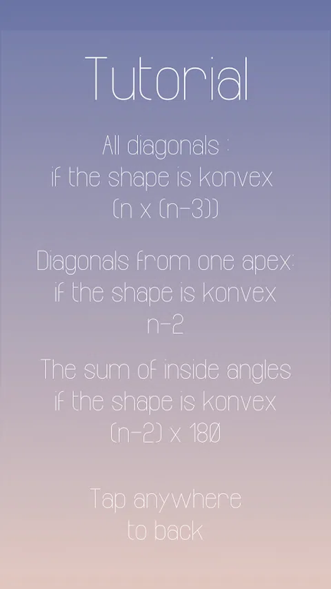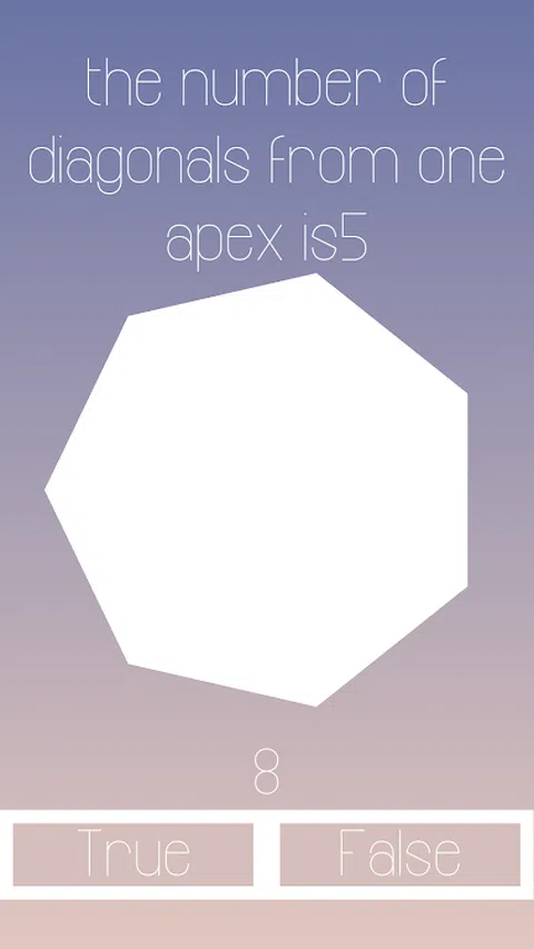 在这个游戏中,你必须从一个陈述中判断它是假的还是真的。 例如,来自一个顶点的所有对角线或内角之和。 特征: - 无尽的乐趣游戏 - 随机生成的形状 -不同的说法 如果您有任何建议让这款游戏变得更好,请随时给我写电子邮件