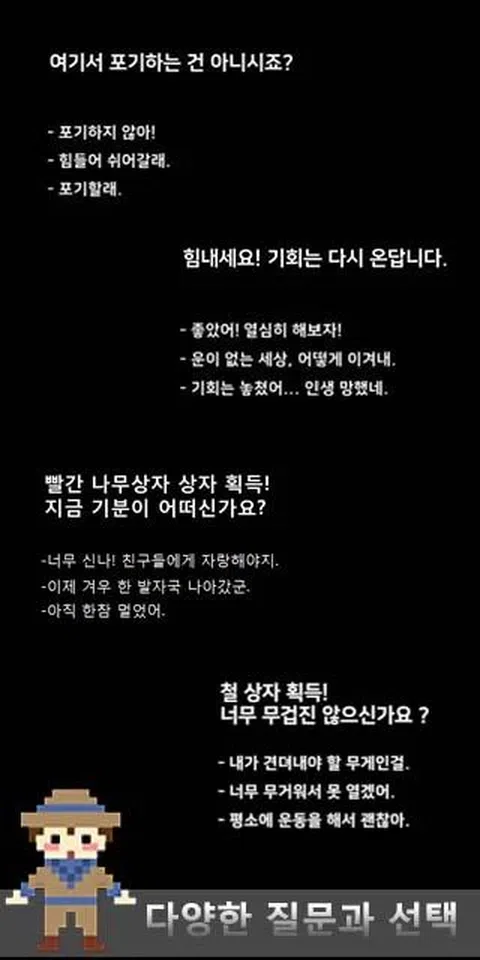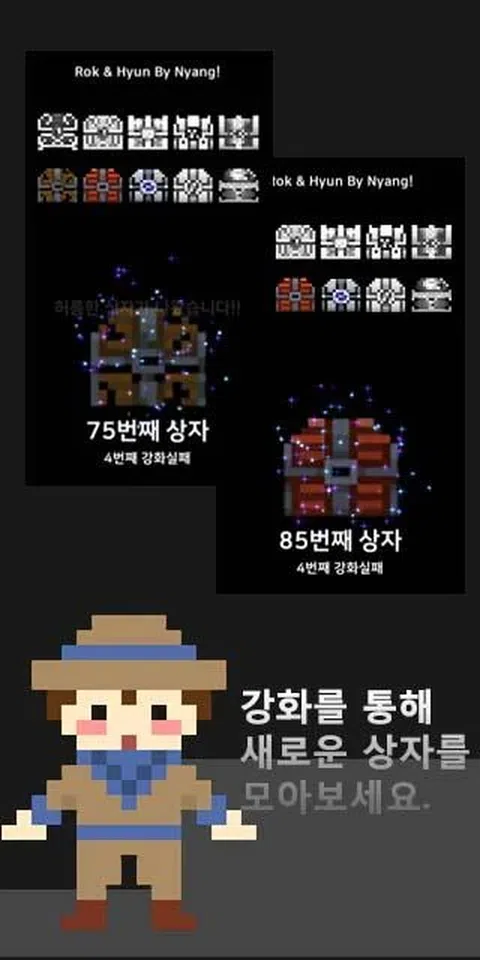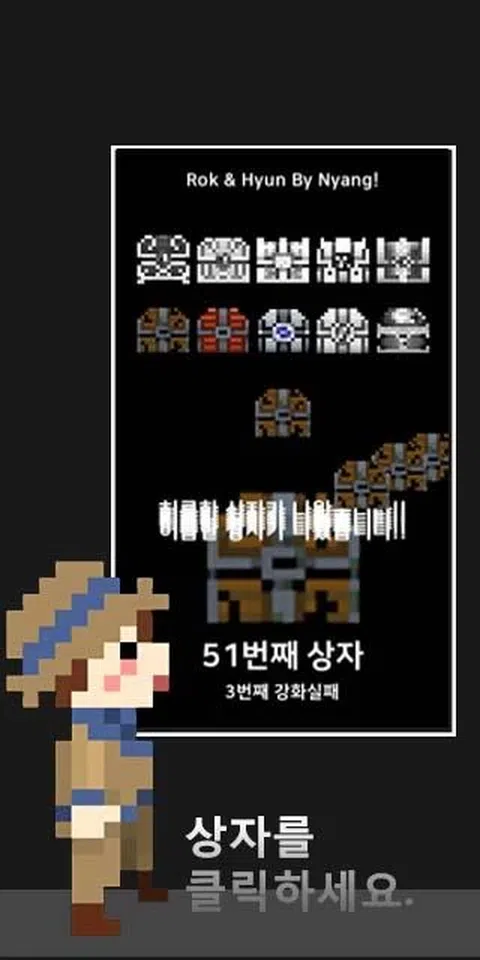 介于休闲和模拟之间的游戏。 运气和选择与努力一样重要。 但如果你不去尝试,运气和选择就毫无意义。 如何操作 单击该框。 选择文本。 ※结局显示5秒。 打开箱子并收集新的箱子。 强化获取新箱子失败或成功时 您可以选择文本。 选择在推进游戏中起着重要作用。 10个盒子和9个结局画面等着你。 这个游戏是由rok和hyun创建的。 查询电子邮件 [电子邮件保护] - 联系方式: 01072708552 在休闲游戏和模拟中的某个地方 幸运和选择的努力很重要。 但我不尝试运气和选择是没有意义的。 运营 单击该框。 选择文本。 ※结局将显示5秒。 打开箱子,看到新的收藏箱。 在强化失败或成功的情况下获得一个新的盒子 您可以选择文本。 在我去的游戏中选择一个重要的角色。 10 个盒子和 9 个结局画面等着你。 此游戏适用于 rok hyun 制作