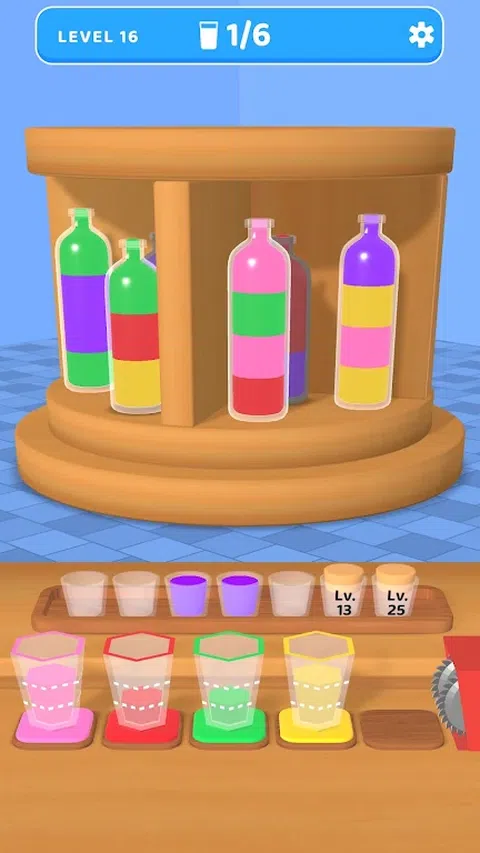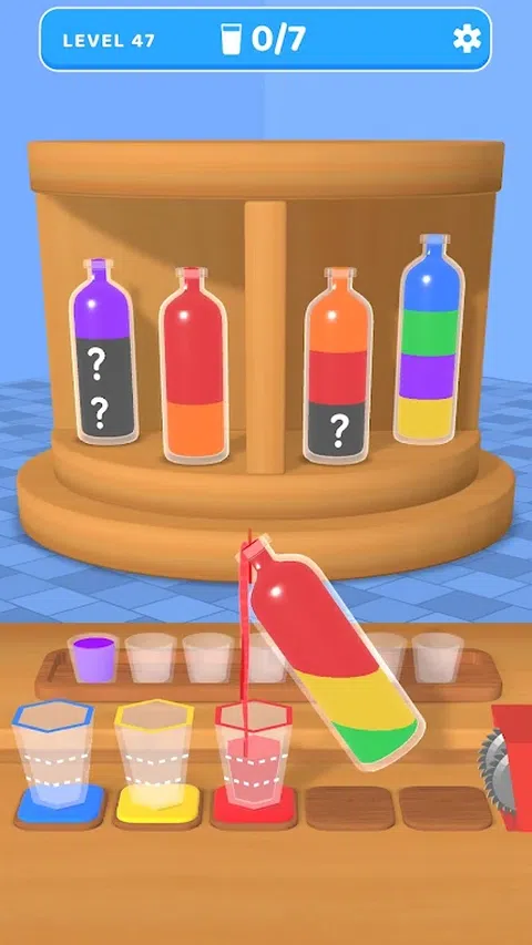 点击架子上的瓶子,匹配玻璃杯中的有色水,直到玻璃杯装满为止! 滑动以旋转架子,并以正确的顺序填充每个玻璃杯,以在玻璃杯到达粉碎机之前匹配水彩。中间的小杯子是收集多余的有色水的地方。没有时间限制:您可以尽情玩耍和放松! 征服每个有趣且具有挑战性的彩色水分类关卡! 潜入众多惊心动魄、引人入胜的水分类和匹配关卡,每个关卡都有自己的特殊谜题和难度