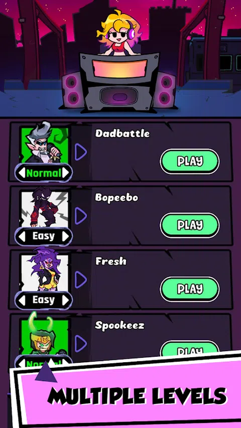 在史诗般的音乐战斗中点燃周五之夜的热度!FNF 游戏! 《Midnight Music Battle》是一款非凡的音乐游戏,您需要运用各种技能才能在时髦的音乐对决中击败对手。这是唯一一款具有在线模式的游戏,可以挑战其他玩家,结交新朋友并获得名声。 Friday Night Funkin' (FNF) 是一款节奏游戏,您必须通过击中音乐箭头来击败 Boss。凭借其幽默的旋律游戏和复古的艺术风格,《FNF》提供了一种有趣而具有挑战性的体验,让您着迷。快来玩 FNF 吧! 玩法:当彩色箭头到达得分区域时,点击它们,与节奏保持同步,击败所有敌人,赢得尊重,赢得女友的芳心! 特点: - 容易上手,但很难掌握。 - FNF 完整 7 周和定期更新的众多 MOD。 - 真实战斗在线模式。 - 可爱的角色:男友、女友、哈吉·沃基、Poppy Playtime 的彩虹朋友、二重奏猫、BanBan 花园的 Jambo Josh、冒名顶替者、海绵宝宝等。 - 充满 FNF 氛围的各种热门歌曲 认为你是最棒的?那就来一场音乐对战吧。 上、下、左、右,保持节拍,战斗到最后一个音符,赢得尊重,赢得女友的芳心