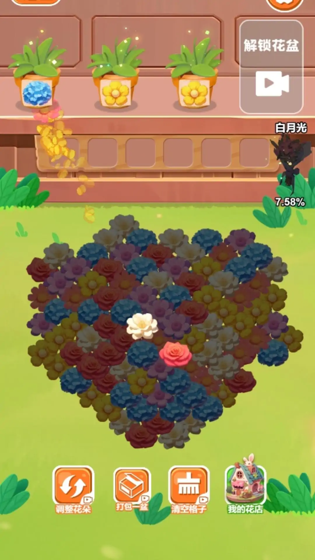 一款超爽超解压的花朵消除小游戏。游戏中,玩家需要根据左上角的花盆,将对应颜色的花朵放入花盆,集齐三朵即可消除并获得一个新花盆。当玩家将界面中的所有花朵全部消除,即可通过关卡,同时解锁并收集一个新的花束。