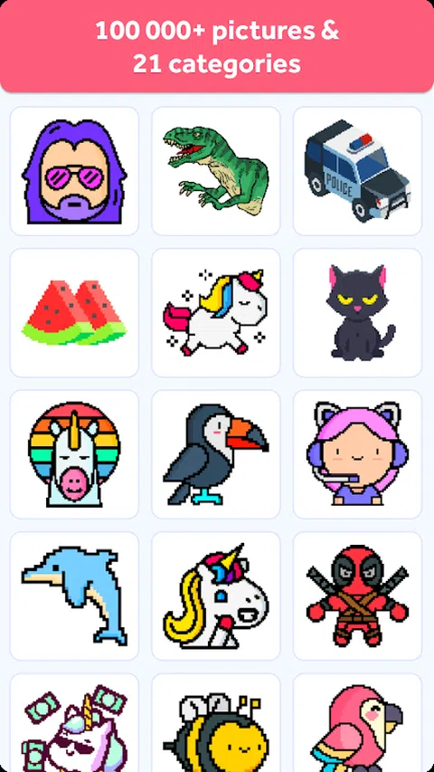 Pixelmania - Color by Number 是缓解压力和放松的最佳游戏。 从许多类别中为您最喜欢的图片着色。 用数字来消除压力! 您还可以创建自己的图片并将其发布到社区,其他玩家可以对您的作品进行评分。 与其他玩家争夺最佳调色师的称号! Pixelmania 有以下类别的图片用于着色:动物、可爱、卡通、自然、花卉、风景、爱情、时尚、音乐、玩具、视频游戏、技术、食品、人、运动、运输、建筑物、万圣节、圣诞节、旗帜 通过用数字为您喜欢的图片着色或创建自己的像素图形来放松! 孩子们的完美游戏,可以通过无数张可供着色的图片来发挥创造力。 Pixelmania 是免费的,您无需为图片付费。 着色并与您的朋友竞争,他们将为最像素化的图片着色
