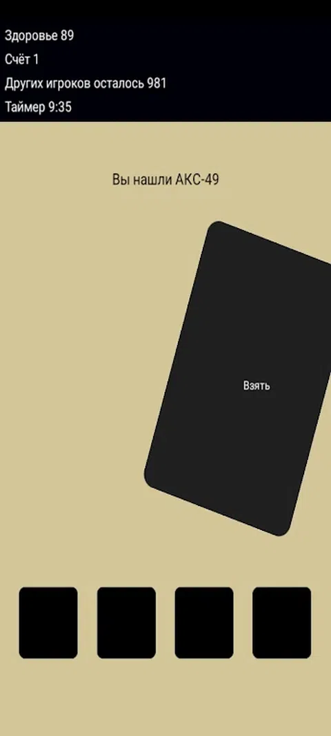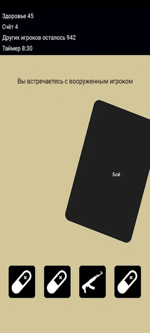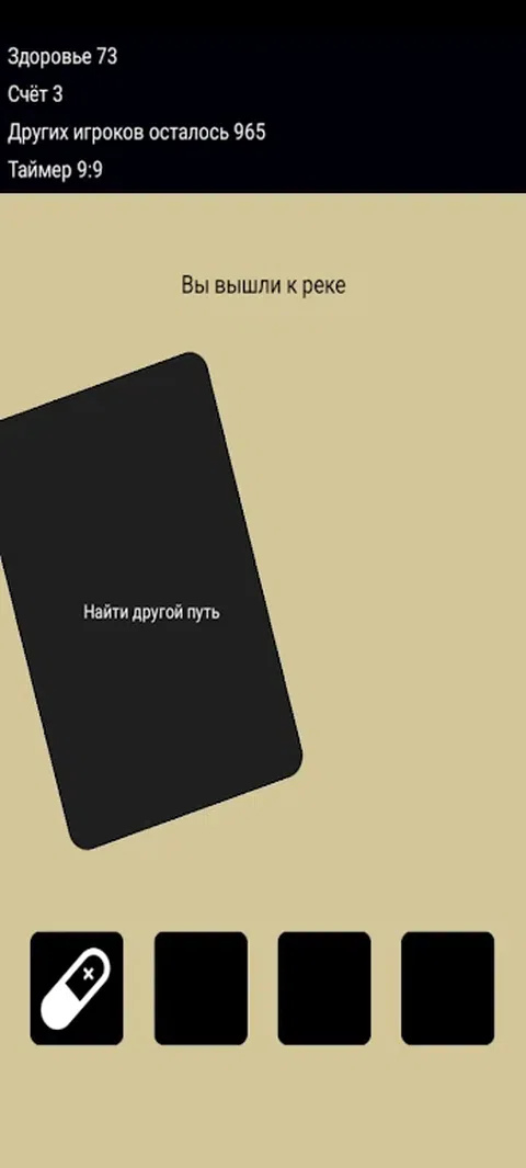CampCard - 文本形式的皇家战斗。一千零一个人发现自己在这个四面环海的岛上。每场比赛,醒来后,您会发现自己处于随机情况,您有两种选择可供选择。作为选择的结果,您可以在您的库存中收到有四个插槽的物品,或者受到伤害,也可以获得积分。每场比赛结束后,您都会保存最终得分。 AKS-49 减少其他玩家的伤害。 如果它低于零,药丸将自动补充您的健康