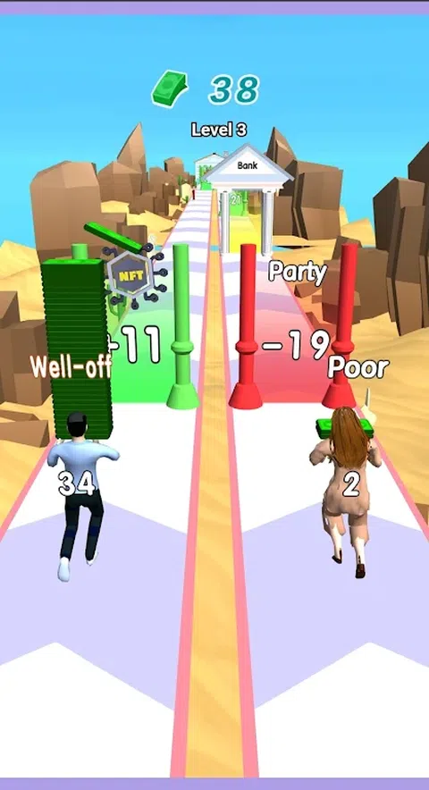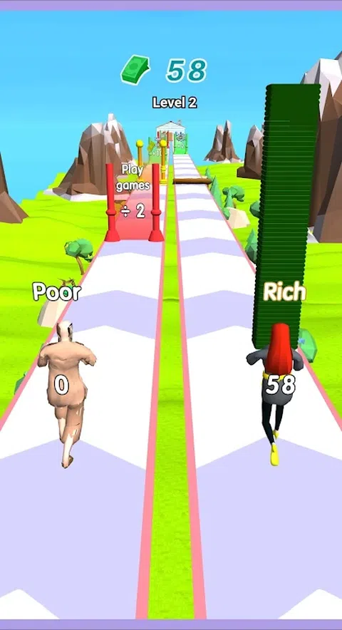 Couple Rich Rush 是一对跑酷街机游戏。你的任务是扮演夫妻,帮助他们一起赚钱并增加他们的财富。这对夫妇可以互相传递金钱,并通过绿色和前门增加他们的钱。不花钱,不吃不喝。您节省的钱可用于装修房子并以华丽的方式装扮您的房子! 在新的激动人心的游戏 Couple Rich Rush 中,您将参加跑步比赛,在此期间您可以赚到很多钱。您的一对英雄将出现在您面前的屏幕上。他们都将站在起跑线上,各自在自己的跑道上。在他们手中,成捆的钱将是可见的。收到信号后,两个角色将同时沿着跑步机向前跑。在他们的路上,力场会出现,可以增加英雄的金钱,反之亦然。您必须仔细查看屏幕。如有必要,将金钱转移给穿过增加金钱的领域的角色。因此,通过执行这些操作,您的英雄将能够到达终点线并成为百万富翁。 主要特征 - 有趣的游戏类型! - 美丽多彩的图形! - 直观的界面! - 轻松控制
