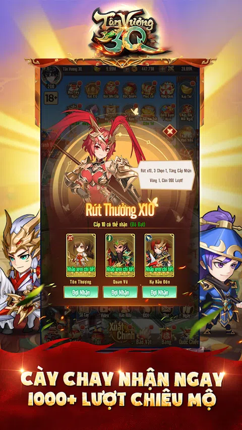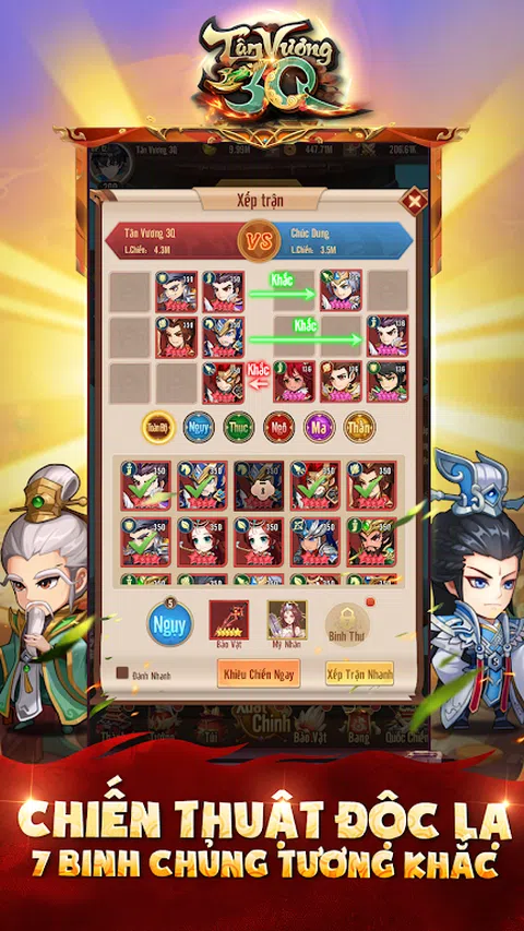 欢迎来到 Tan Vuong 3Q 时代 - AFK 放置类手游,三国主题超酷。 - - - 特殊功能 - - - * 空闲空闲游戏: Tan Vuong 3Q 拥有AFK Idle 游戏模式,采用“潮流”竖屏风格,让您沉浸在一流的战略世界中,无需耕种或经常在线,解放双手。 * 成千上万的将军 - 标准动作三个王国: 多样的武将系统,完善的防御,互动互动,保证给你带来不一样的体验。近百名三国名将,分属于魏-特-吴-丹-马5个派系。 此外,武将分为刀兵、枪兵、骑兵、弓兵、盾兵、法师、医师7种兵种,系统互不兼容。 * 超级可爱的赤壁 3Q 图形: 一流的 Chibi 图形,每个细节都很清晰。总制投资造型青春靓丽。 * 招聘美女 - 连接洪仁: 与Dieu Thuyen、Tieu Kieu、Chan Co等绝色美人相爱并增加亲密度,上阵助威 * 民族战争的出走 - Nhat Thong Thien Ha: 与许多其他公会一起加入攻城战,争夺资源。玩家将带领他们的军队挑战城堡。占领更多获得各种好处