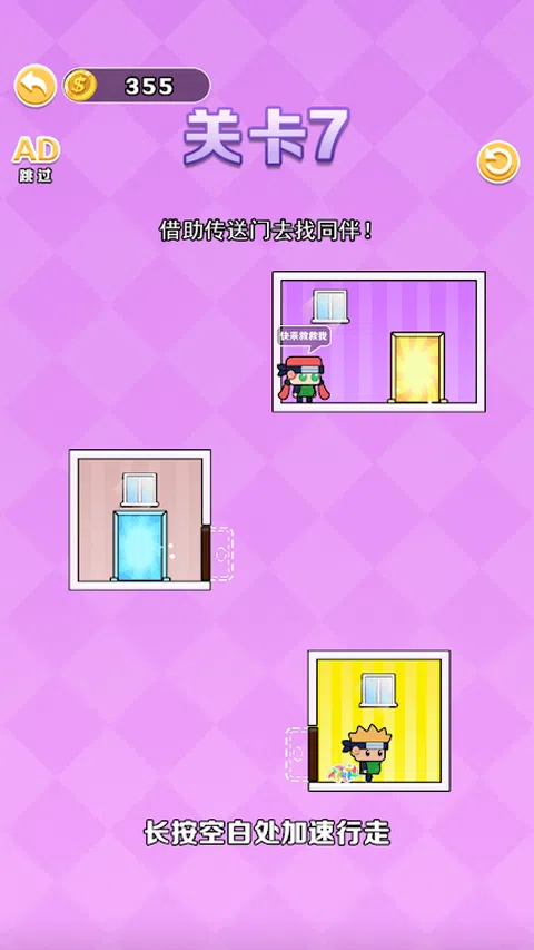 恋爱大冒险,一款玩法简单的解谜闯关休闲益智类的游戏。简约大方的游戏画面、简单易上手的操作方式和极具挑战性的玩法,让小伙伴们爱不释手! 游戏中,你需要帮助男孩在各个房间中穿梭,从而进入目标房间见到自己的女友!当然里面也有各种各样的陷阱,小心不要进入了陷阱的房间里!随着关卡的升级,解谜难度也随之增加,你需要更大的脑洞思考如何见到女友! 丰富的创意和有趣的关卡可能会打破常识,为您带来新的益智解谜体验!游戏画面精致,关卡丰富,规则简单,体验脑洞大开的解谜乐趣。 妙趣横生,趣味休闲,立即下载来体验不一样的解谜闯关游戏吧