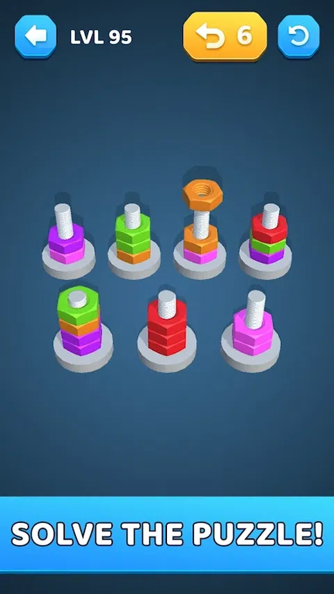 欢迎来到 Nut Bolt Color Sort 3D,终极颜色分类益智游戏,它将放松您的思维并提高您的大脑!这款游戏拥有超过 200 个令人上瘾的游戏关卡,非常适合任何寻求有趣挑战的人。 在 Nut Bolt Color Sort 3D 中,您的目标既简单又引人入胜:点击螺栓并将彩色螺母移动到匹配的螺栓上以解决难题。玩法简单,分类也很简单。此外,无论有没有网络连接,您都可以随时随地享受游戏。 挑战自己,挑战超过 200 个独特而令人上瘾的关卡,考验你的分类技能。提前思考并仔细计划您的移动,以避开障碍并实现完美匹配。随着你征服的每个级别,你将解锁新的挑战和奖励,保持兴奋。 主要特点: 1. 丰富多彩的大脑益智游戏主题 2. 200 多个独特且令人上瘾的关卡 3. 在线或离线玩 4. 在玩乐的同时提高您的脑力 5. 经典的排序益智玩法 6. 消磨时间的游戏 怎么玩: 1. 用螺母敲击螺栓。 2. 将相同颜色的螺母移到螺栓上。 3.仔细计划你的移动,避开障碍物。 4.将相同颜色的所有坚果分类以赢得关卡。 5. 收集奖金并解锁奖励,以熟练地解决难题。 无论您是益智爱好者还是只是在寻找一种有趣的放松方式,这款游戏都非常适合所有类型的用户和技能水平。 立即下载 3D 螺母螺栓颜色分类,开始分类,走向胜利