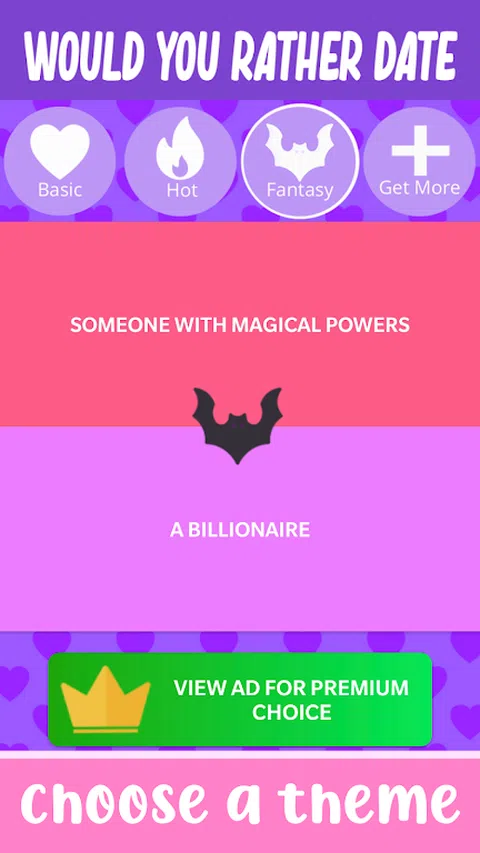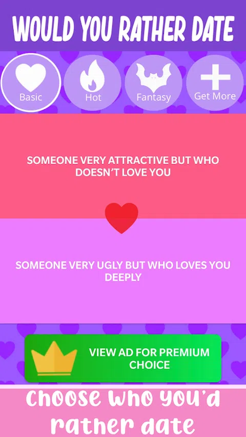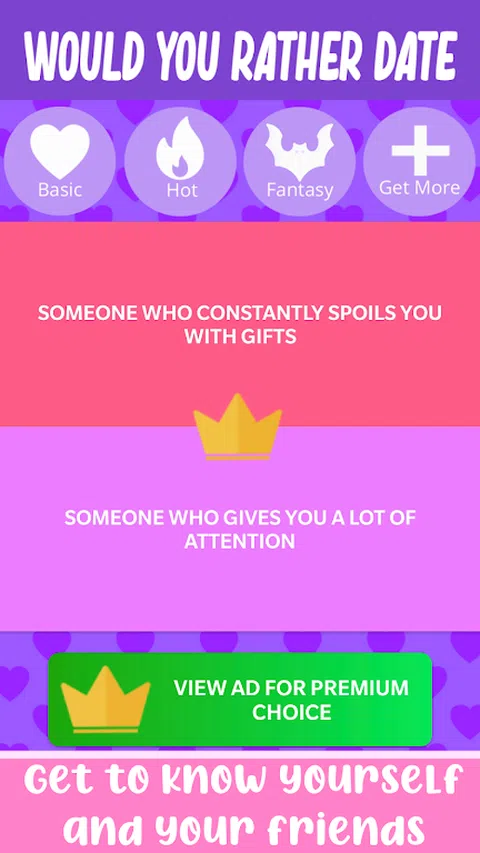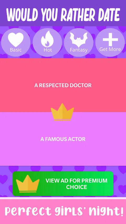 有趣的派对游戏,非常适合女孩的夜晚!让你的女朋友选择她们更愿意约会的人,并了解她们所有的小秘密。 他们是选择超级富豪还是长相最帅的人?他们更喜欢男子气概的类型还是敏感的男朋友?以一种有趣的方式找出您朋友的好恶,并将您获得的结果与其他人的结果进行比较! 《你选择约会》非常适合女孩之夜、单身派对、母鸡派对、最好朋友的生日或任何需要招待女朋友的聚会。 从关于爱情和人际关系的深层次困境到关于约会的愚蠢问题,《你选择约会》拥有与朋友度过有趣而热闹的夜晚所需的一切,或者自己与他人比较答案,享受乐趣。 谁知道呢,也许你最终会发现关于你的女朋友或你自己的新东西
