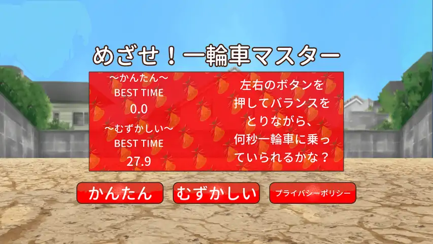 《Aim! Unicycle Master》是一种发育障碍(自闭症、阿斯伯格综合症、注意力缺陷多动障碍(ADHD)、 这是一款针对有学习障碍和抽动障碍儿童的治疗和教育游戏应用程序。 这是一款适合残疾儿童的简单游戏应用程序。 ◆ 规则超级简单 ◆ 一个简单的游戏,玩家骑着独轮车,按左右键来平衡! 如果玩家接触到地面或墙壁,游戏就结束了! 通过按左右按钮保持平衡,您可以骑独轮车多少秒? 您可以从“简单/困难”中选择难度级别! 选择适合你的难度等级,记录你最好的时光! 目标!真正的独轮车大师