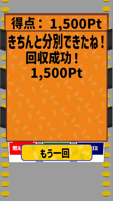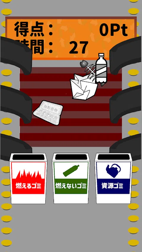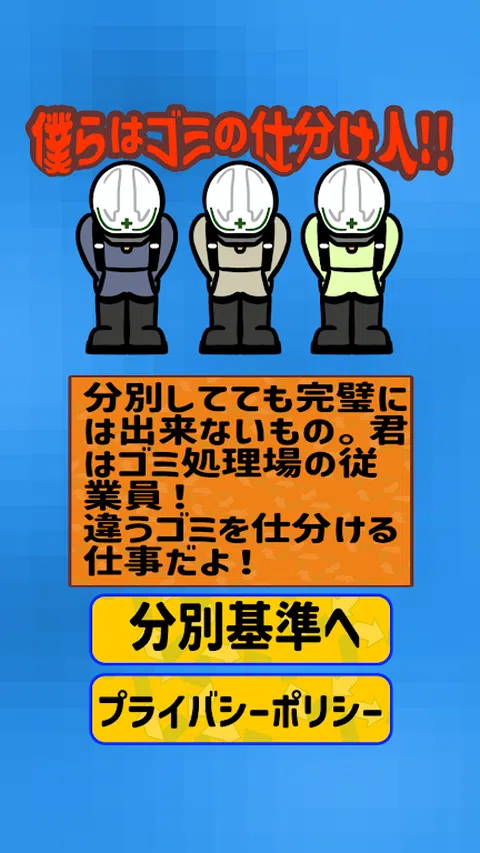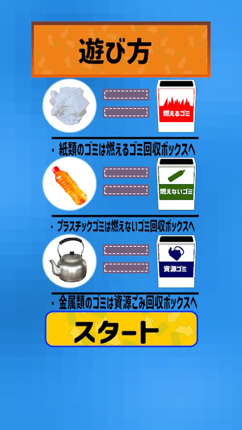 “我们是垃圾分类员!” 这是一款针对有学习障碍和抽动障碍儿童的治疗和教育游戏应用程序。 这是一款适合残疾儿童的简单游戏应用程序。 ◆ 规则超级简单 ◆ 你(玩家)是垃圾填埋场的员工! 将即使分开也无法做到完美的不同垃圾进行分类是一项工作! 可燃垃圾、塑料垃圾(不可燃垃圾)、资源垃圾、 通过正确的分类收集垃圾吧! 如果正确收集可燃垃圾,得分将增加 50 分。 收集不可燃垃圾增加100分,收集资源垃圾增加500分。 时间限制为 30 秒。 及时识别垃圾种类并大量收集, 瞄准高分